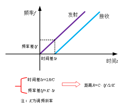调频连续波雷达物位计的通用原理为雷达在罐顶发射电磁波,电磁波碰到介质反射后被雷达接收,接收信号与发射信号之间的频率差δ f与介质表面的距离R成一定比例关系:R=C (速度)*δ f(频率差)/2/ K(调频斜率)。因为光速C和调频斜率 K已知,因此估算出频率差δ f,便可得到雷达安装位置料面的距离R,再通过已知的罐体总高,减去雷达到料面的空间距离(简称空高),得出料位的高度。