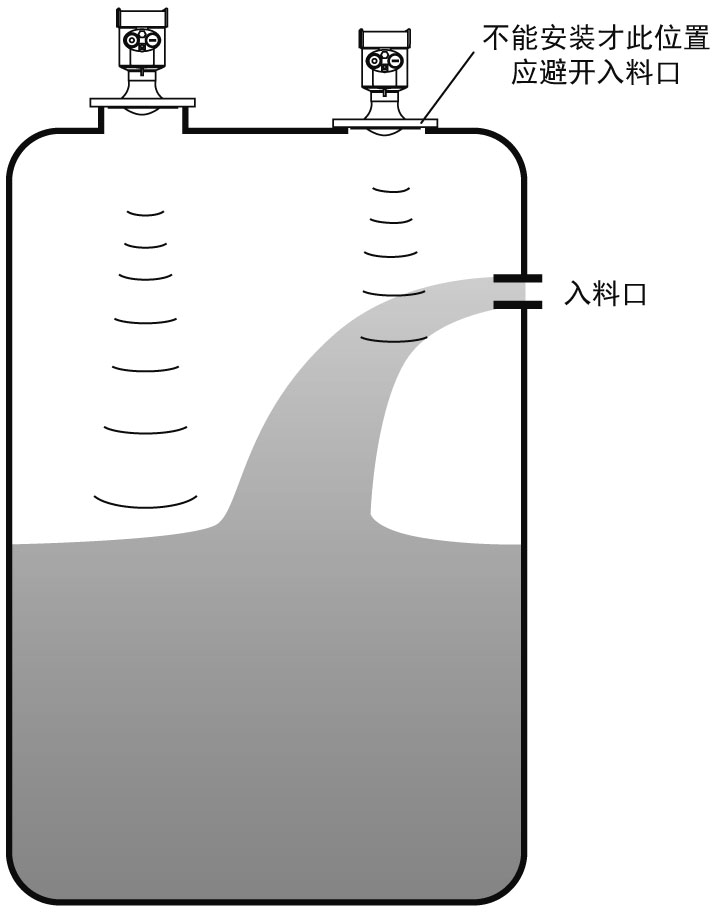仪表在安装时避免安装在入料口的上方,尽量避开各种影响信号的物体,如搅拌桨等